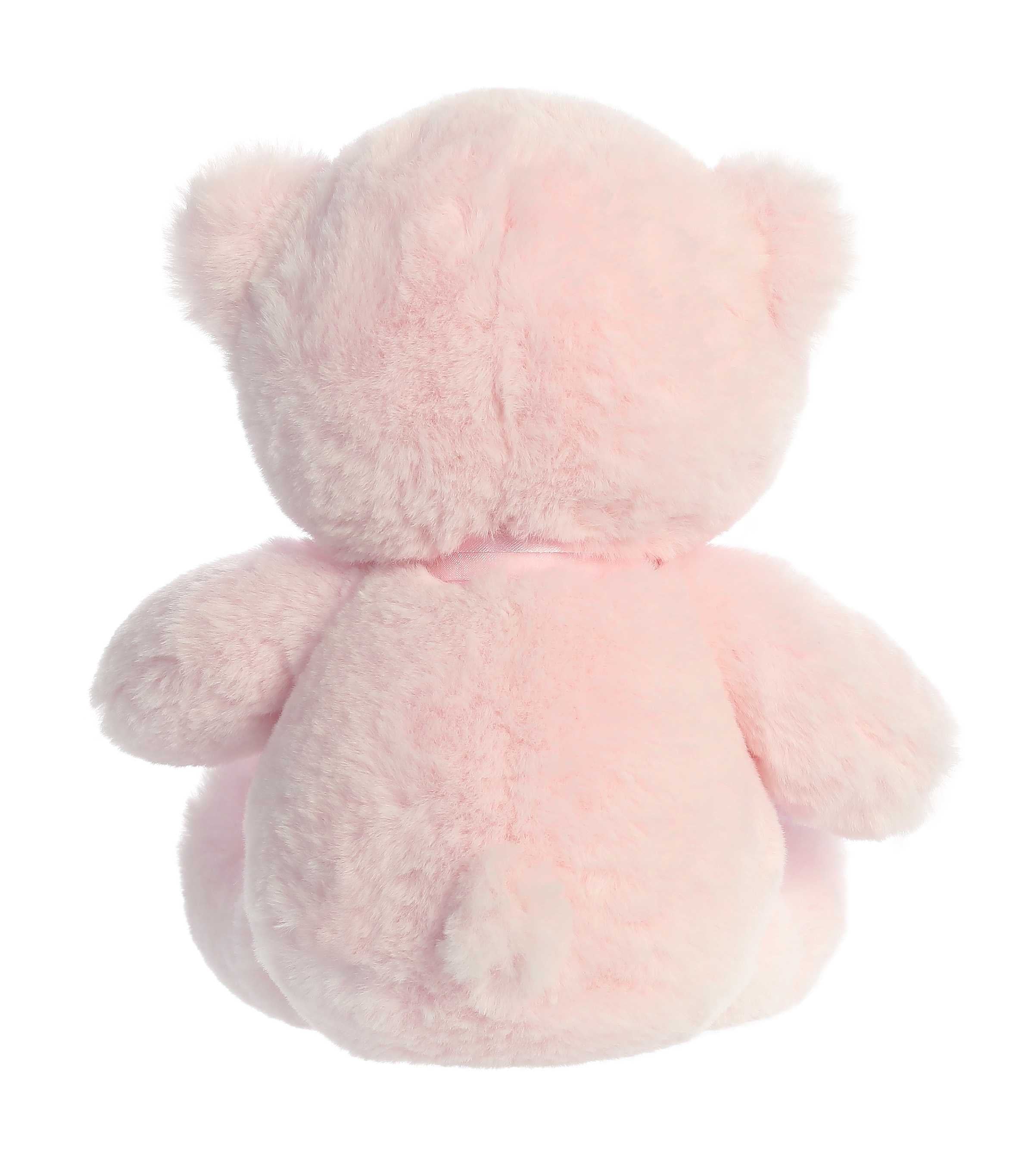 A pink teddy bear plush toy from ebba baby toys with a satin bow and embroidered eyes.