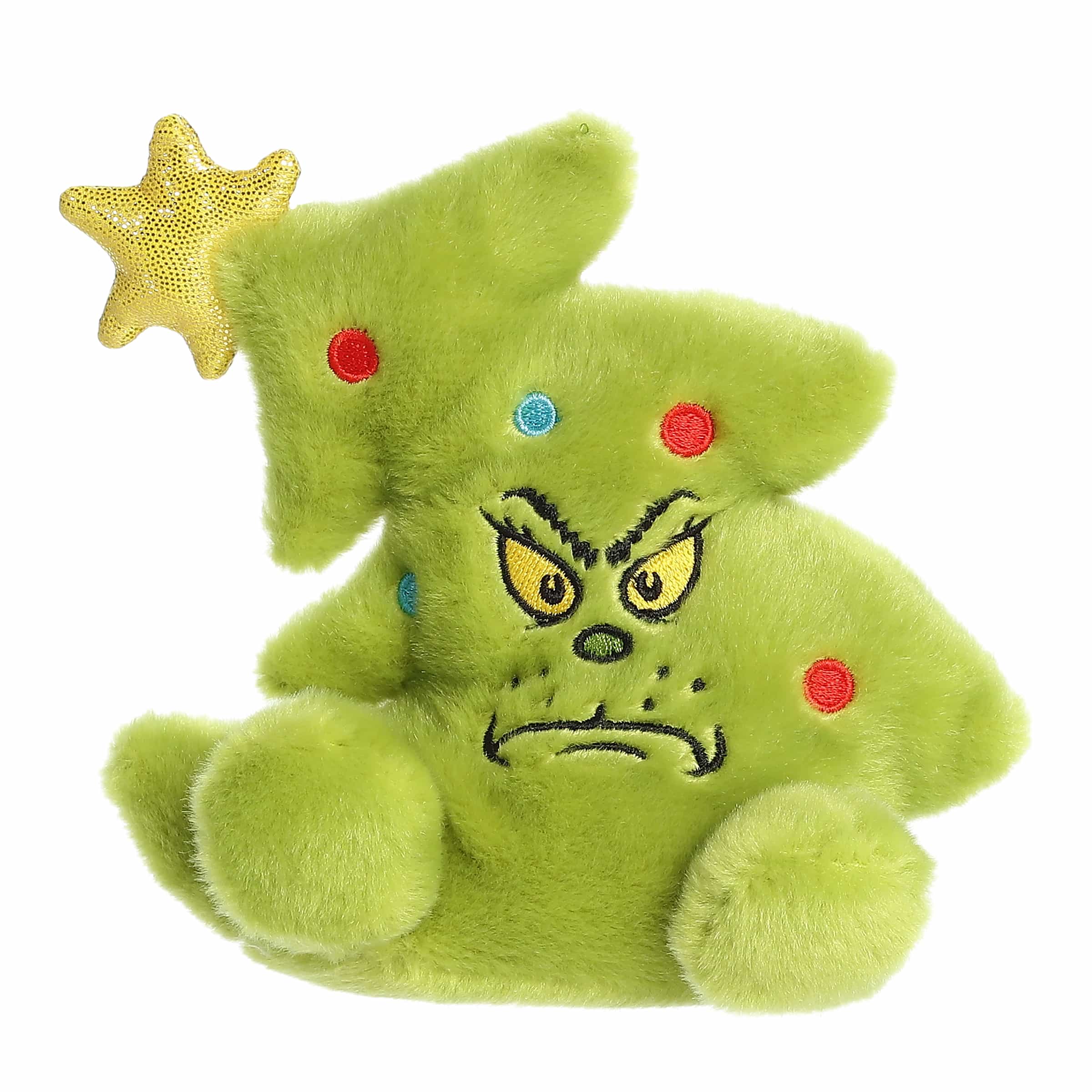 Vivid green Christmas tree plush with Grinch face, colorful ornaments, and a bright star