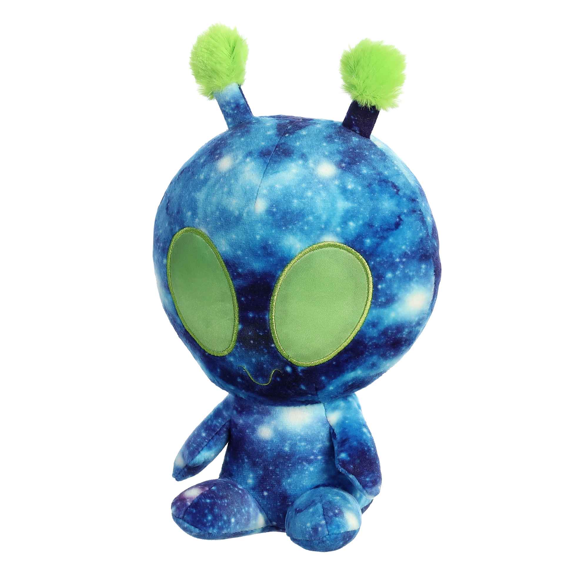 Galactic Cuties are out of this World! Watch as their eyes glow, change colors and flicker as you press on their left foot. Alien Nebula is a blue galaxy themed alien with two antennas and big green eyes. A plush companion from galaxies far away, this Alien is sure to be the highlight of your entire plush collection.