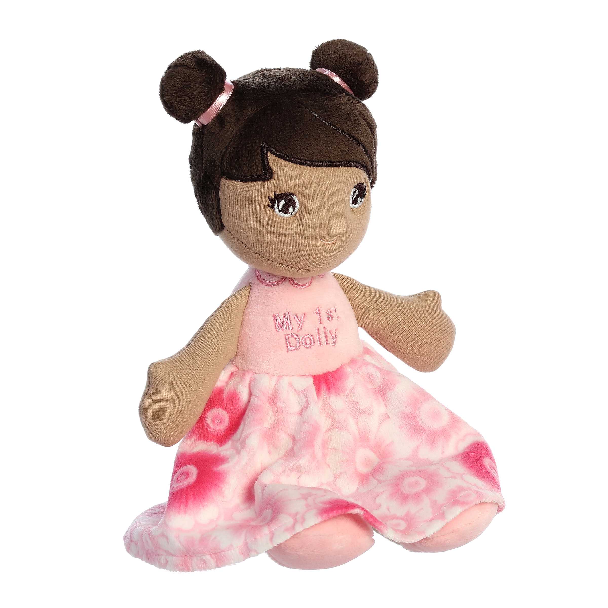 Ready to create everlasting memories with a beautiful plush doll. My First Doll is sweet and delicate, featuring brown hair is ready for endless pretend play. She is dressed in a pink floral dress with "My 1st Dolly" embroidered on the front center, and her fabric hair is styled into buns secured with pink bows. This doll is sure to become a best friend.