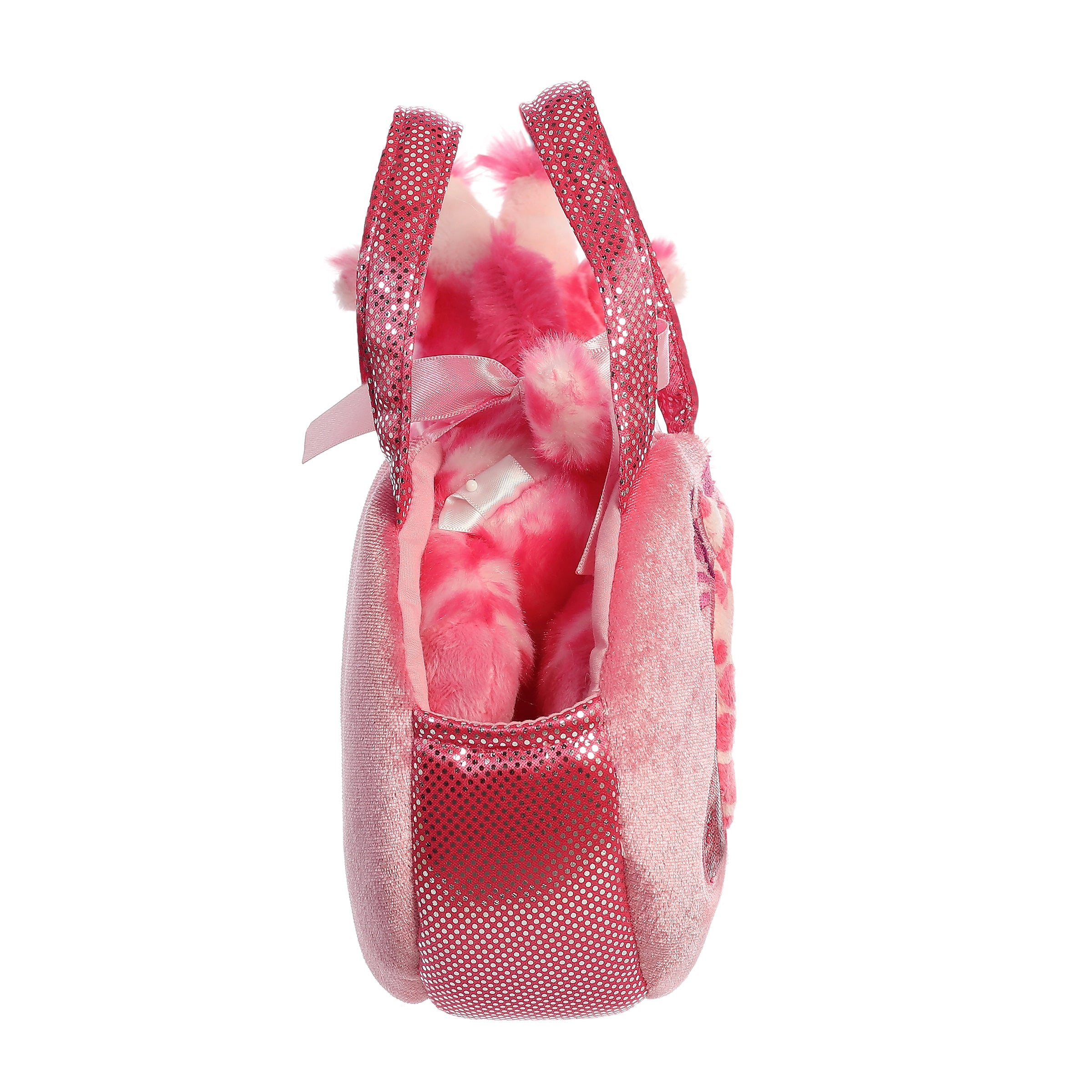 Step into a whimsical world with the Jungle Bundles Giraffe plush and carrier set from the Fancy Pals collection by Aurora World. This enchanting set features a plush giraffe with a vibrant pink and soft white color scheme, complete with playful spots and a fluffy mane. The giraffe is snugly nestled in a matching pink carrier adorned with a giraffe face and sparkling polka dots, making the plush both adorable and stylish.