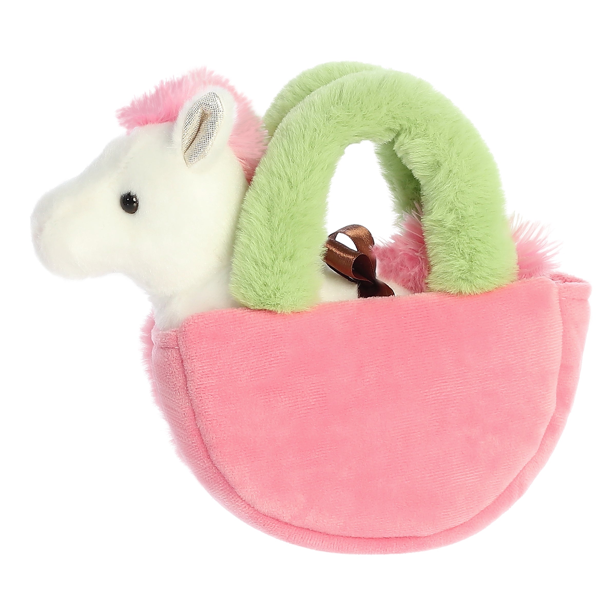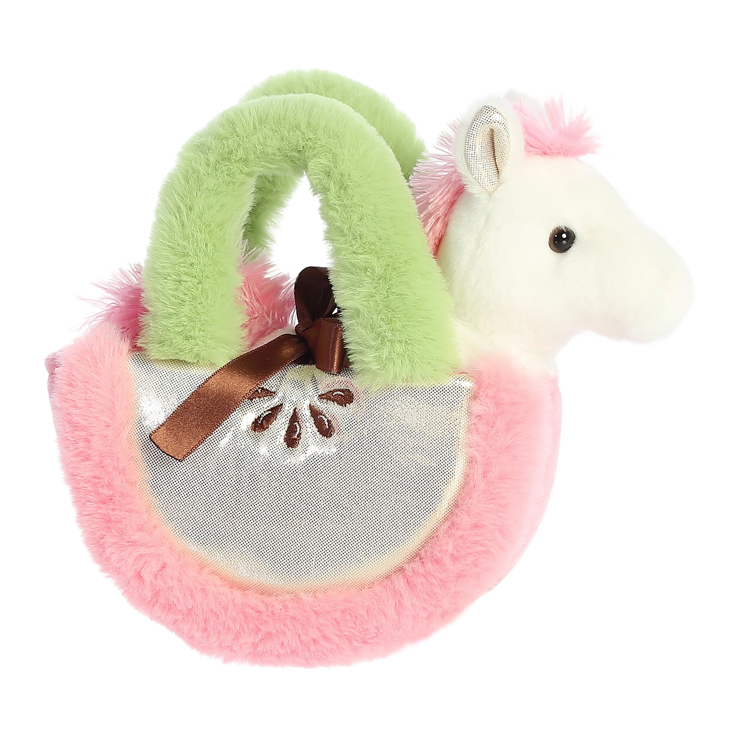 Collect the Apple Pony plush carrier, a delightful blend of whimsy and cuteness. Nestled inside an apple core-themed carrier is a fuzzy white and pink pony, ready to gallop into your heart and your daily adventures.
