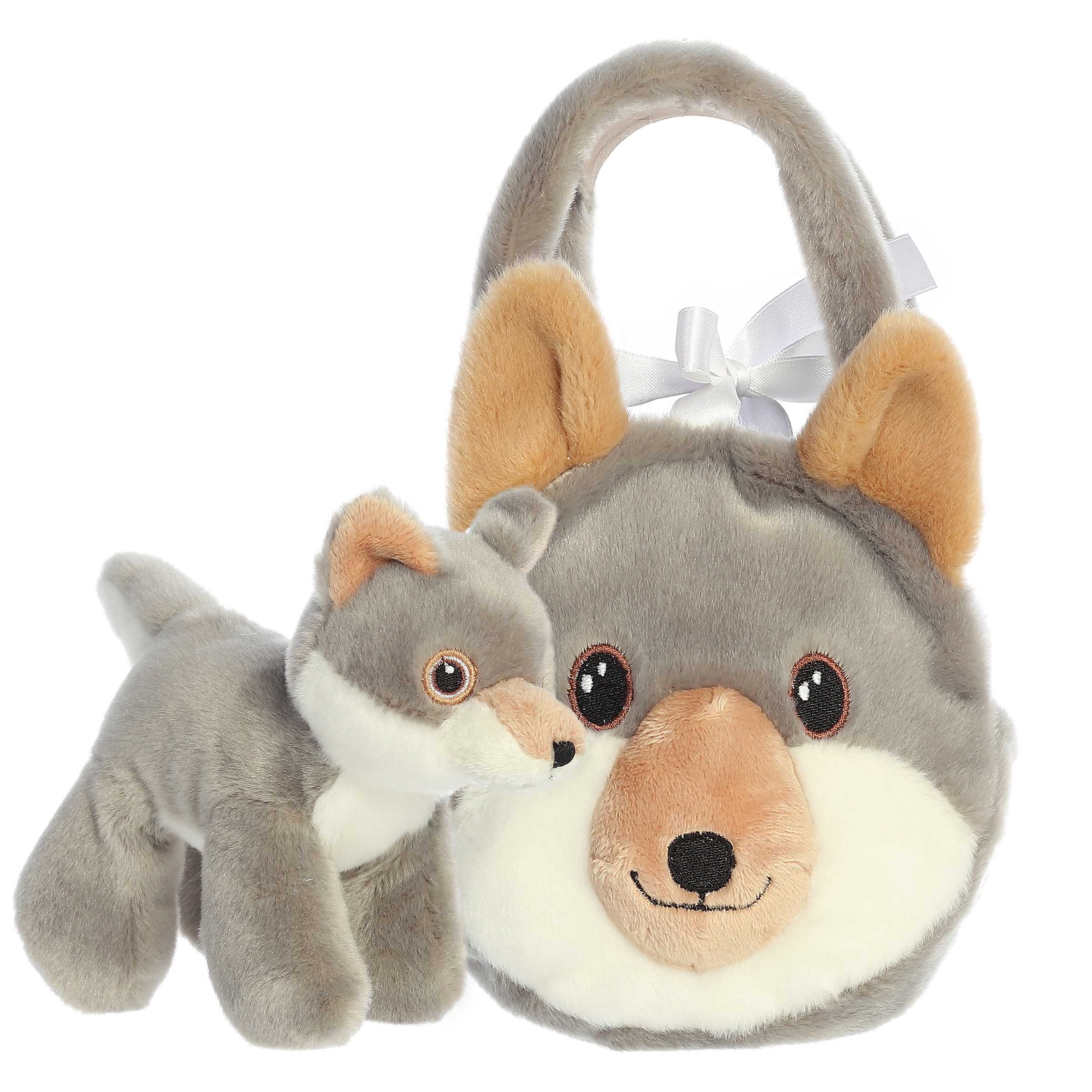 Eco Nation Wolf Plush in a carrier shaped like a wolf face, made from recycled materials.