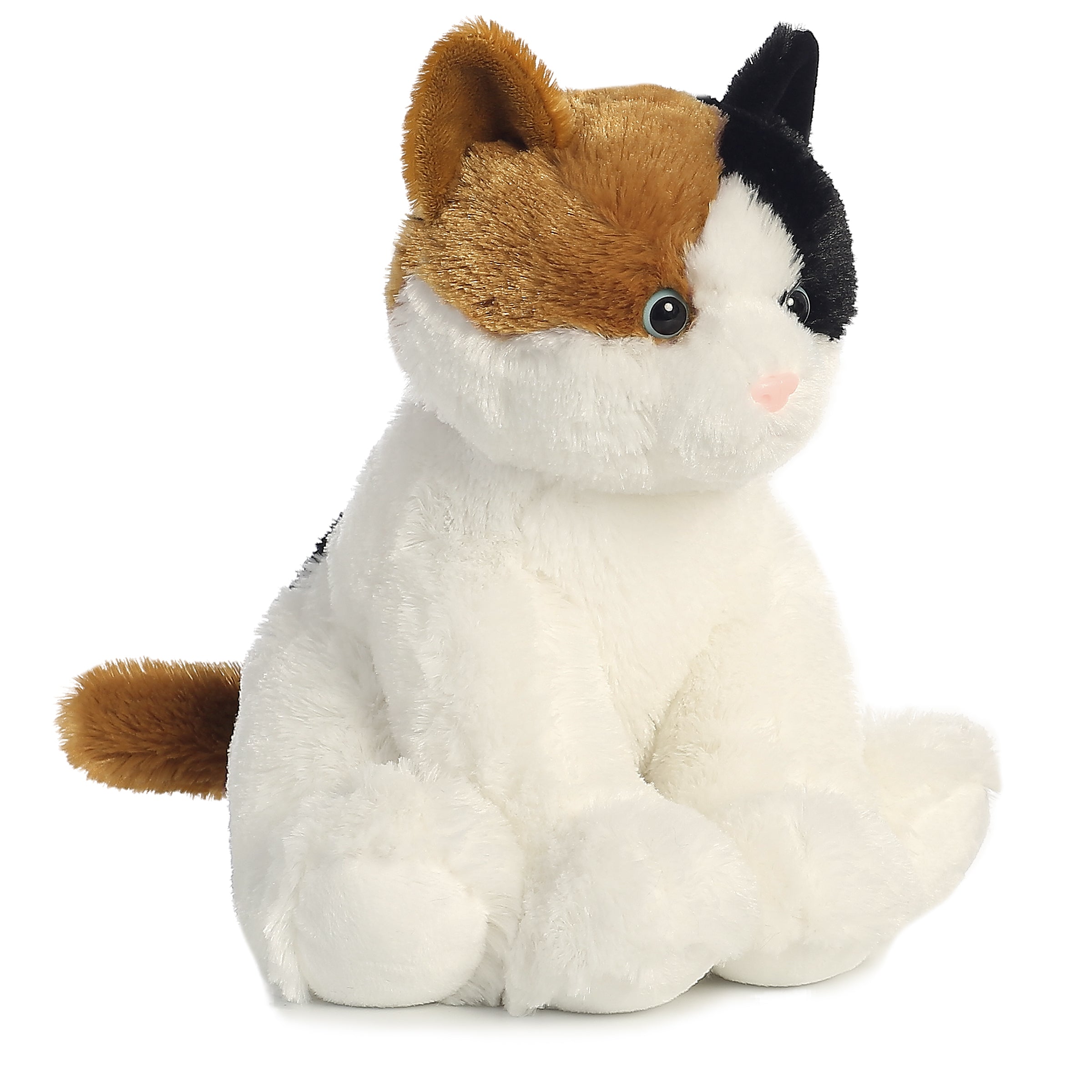 Meet Esmeralda, the adorable Calico Cat Plush from Aurora's esteemed collection. Crafted with the softest materials, Esmeralda's fluffy white, black, and golden fur, along with her loving gaze, is irresistible to the touch and sight.