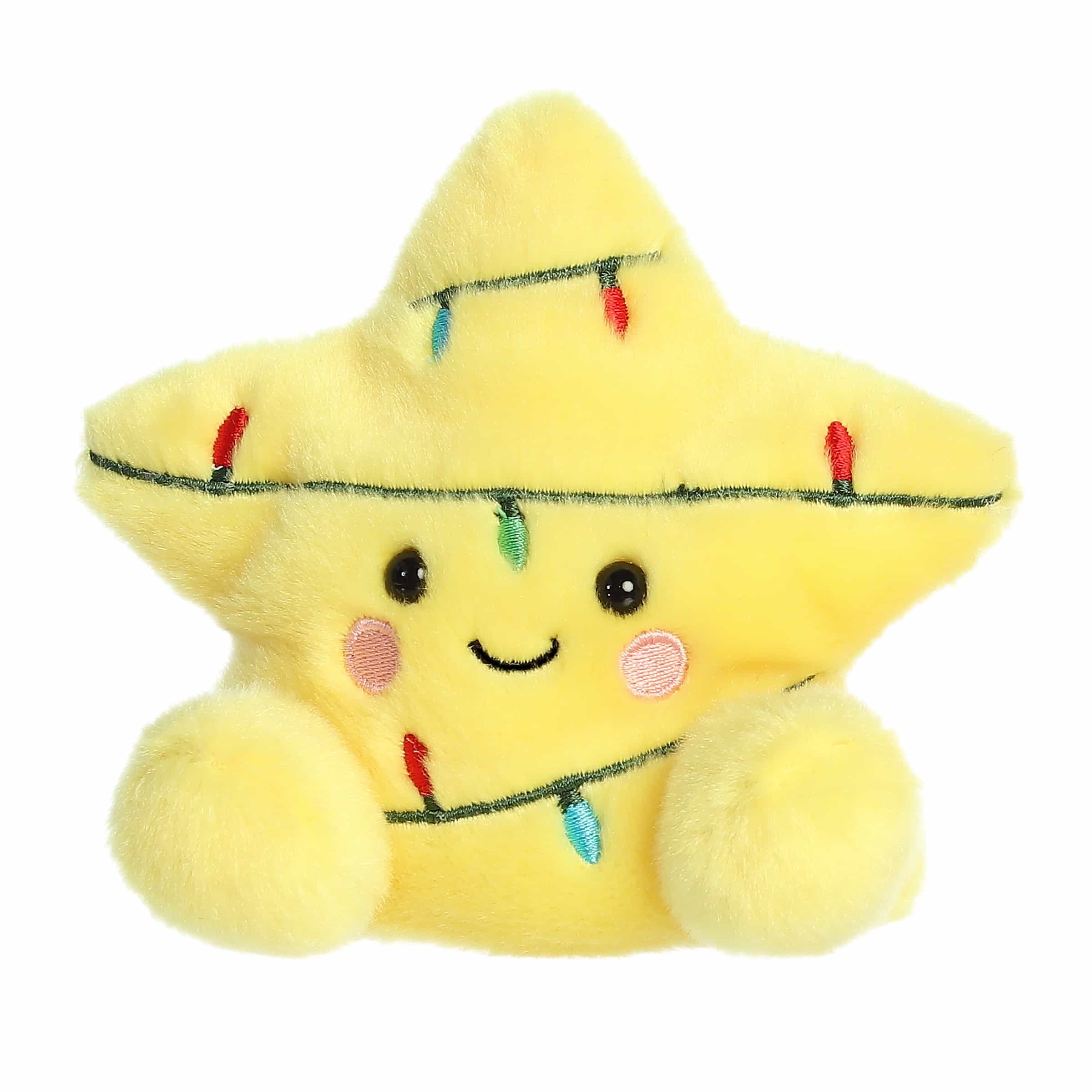 Golden-yellow star plush with embroidered string lights, rosy cheeks, and a big smile