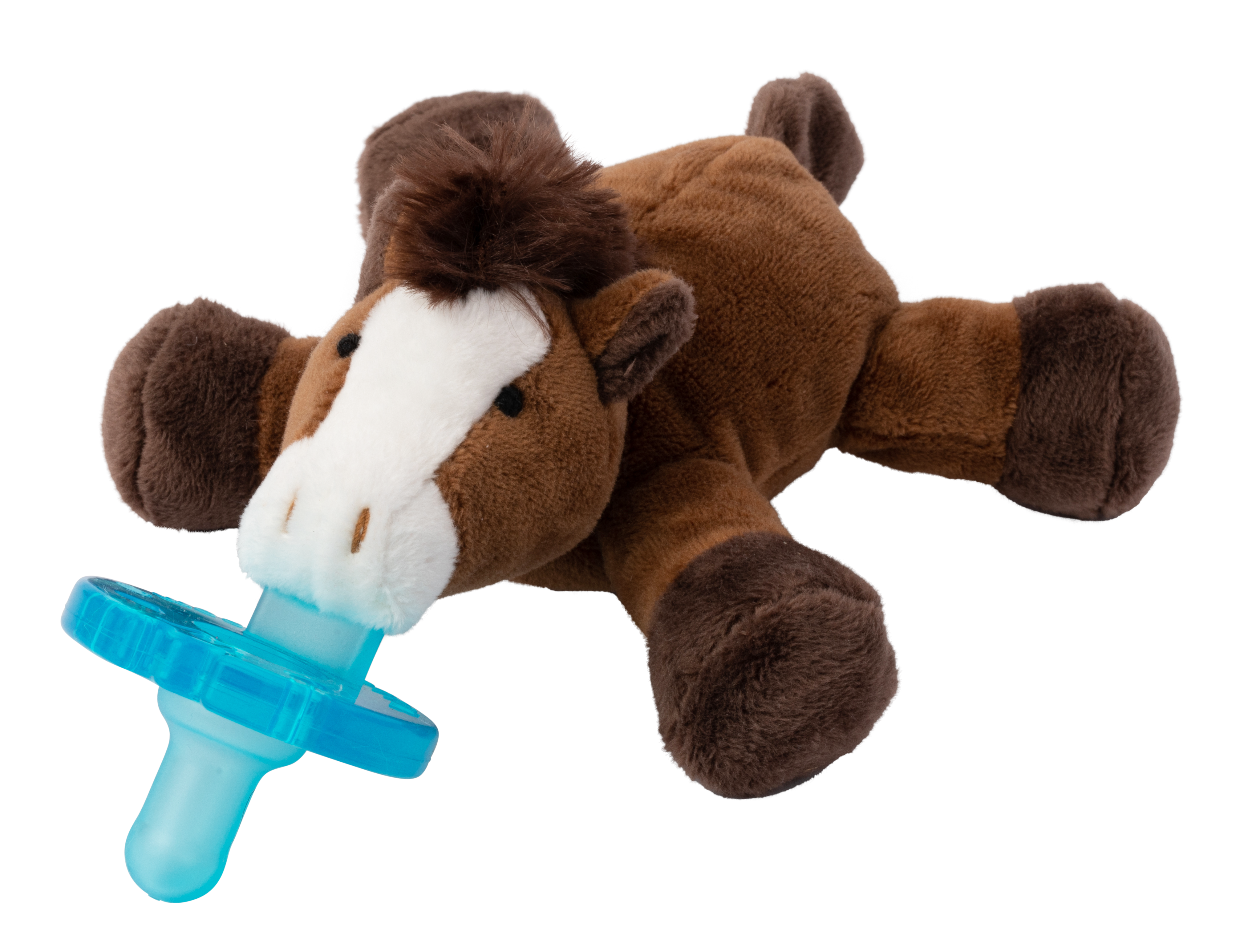 Attached to the plush Brown Horse, the unique style of the WubbaNub pacifier allows it to remain close and easily positioned by the baby. Easy to grasp, nearly impossible to lose and may assist baby to self soothe.
